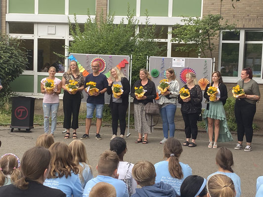 Mit einem lachenden und einem weinenden Auge sagen die Klassenlehrerinnen, Fachlehrkräfte, Schulleitung und die Kinder der anderen Jahrgänge "Goodbye".